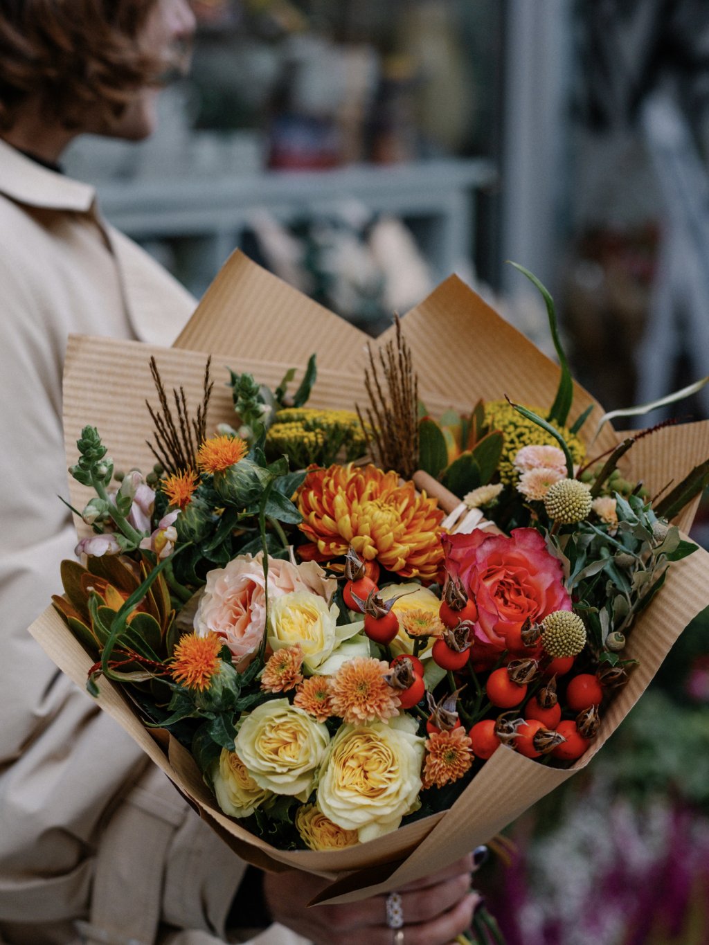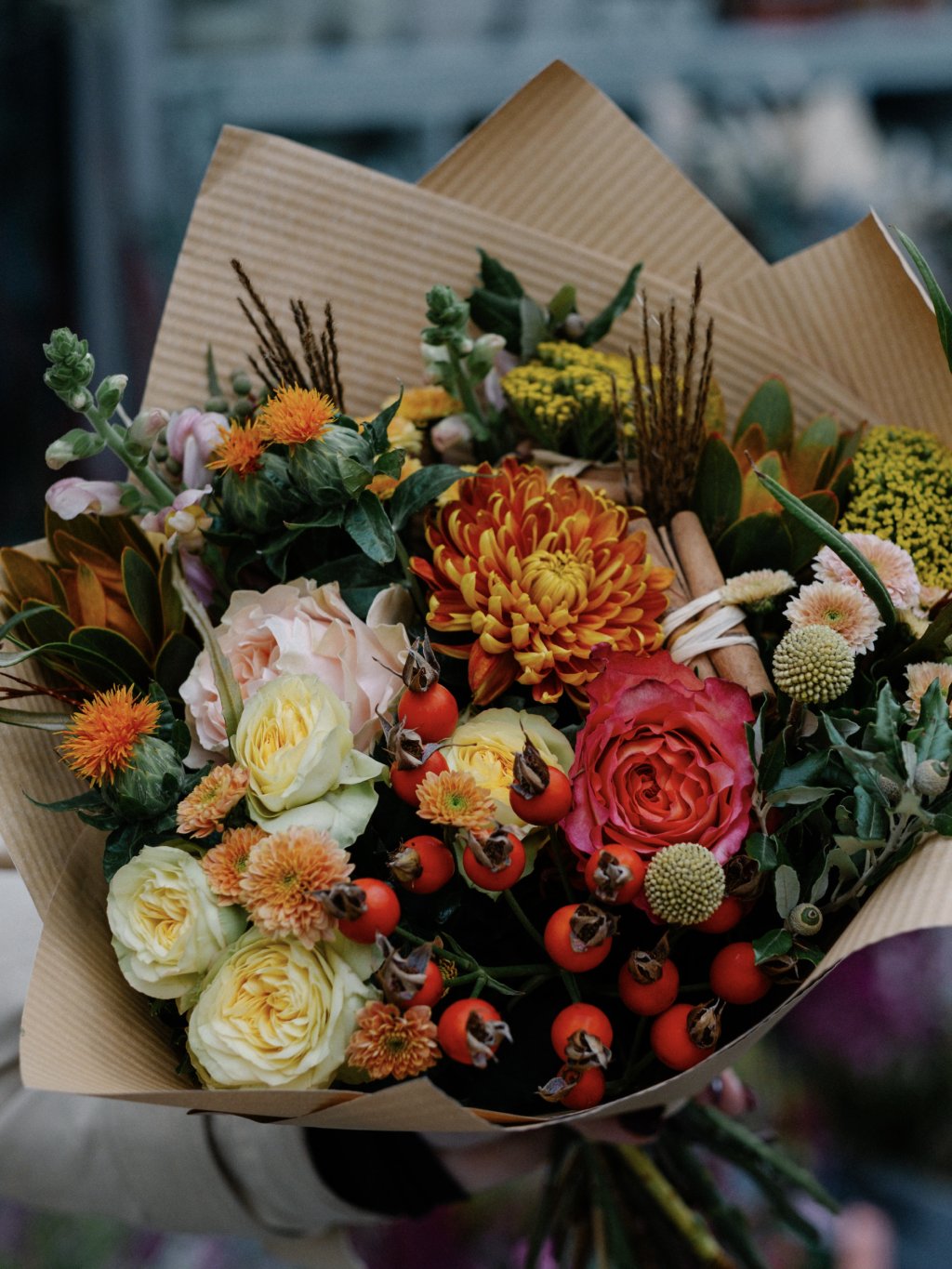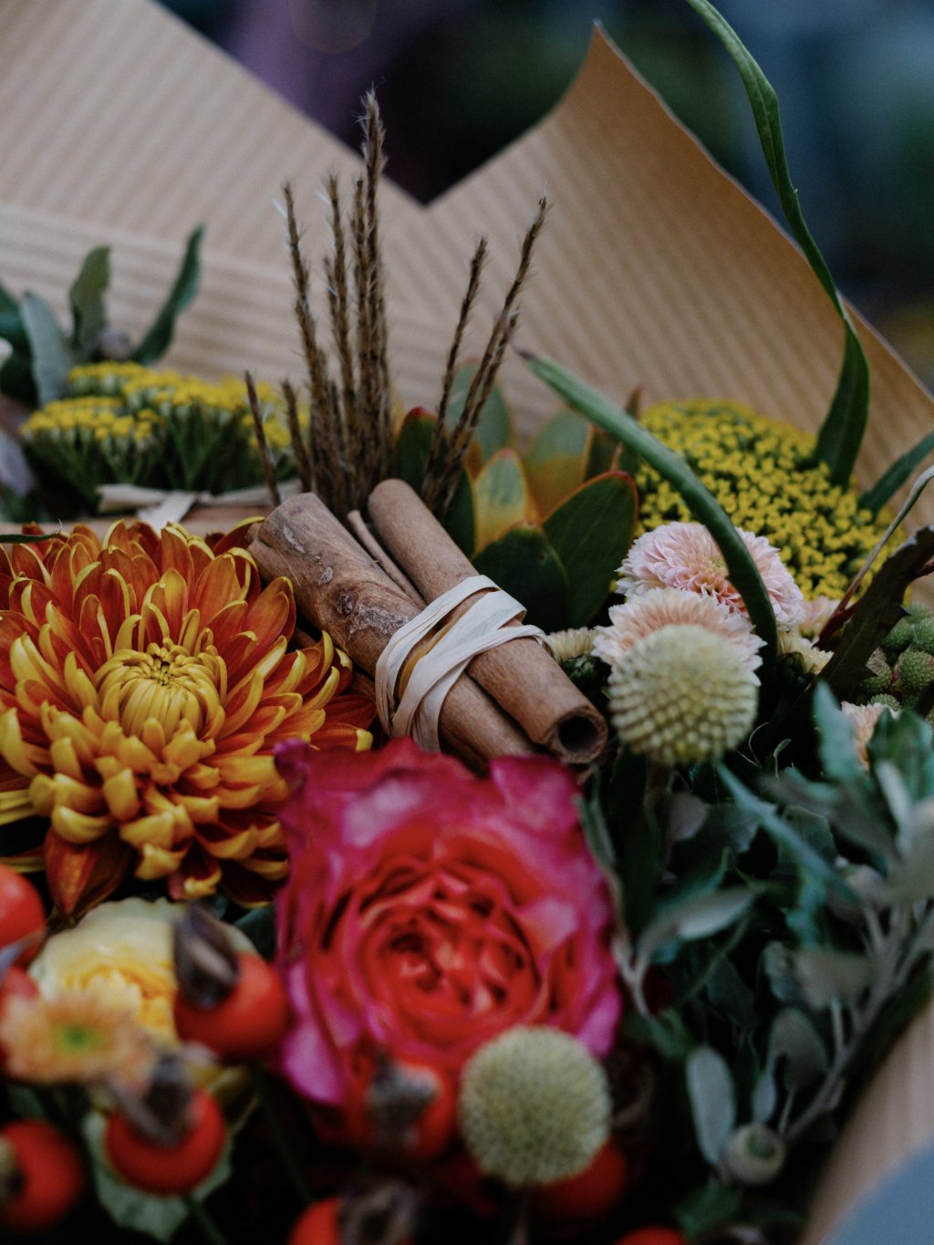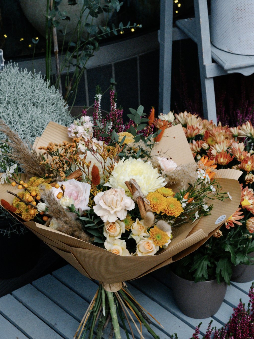Kytice, která voní po pečeném podzimu. Kombinace teplých tónů oranžové, žluté a krémové připomíná podvečer strávený doma, když se venku šeří a ve vzduchu je cítit skořice. Každý květ je jako kousek dýňového koláče – sladký, hřejivý a prostoupený kouzlem okamžiku.