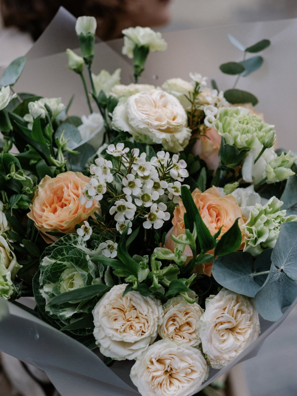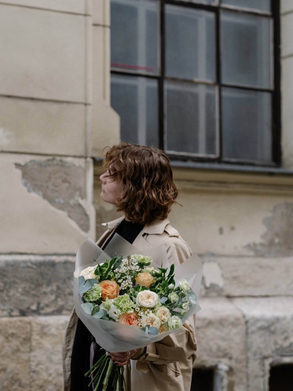 Kytice v meruňkových a svěže zelených tónech připomíná moment, kdy se po zimě objeví první teplé slunce. Lehké a přirozené barvy působí jako první paprsky, které zahřejí tvář a připomenou, že jaro je tady.