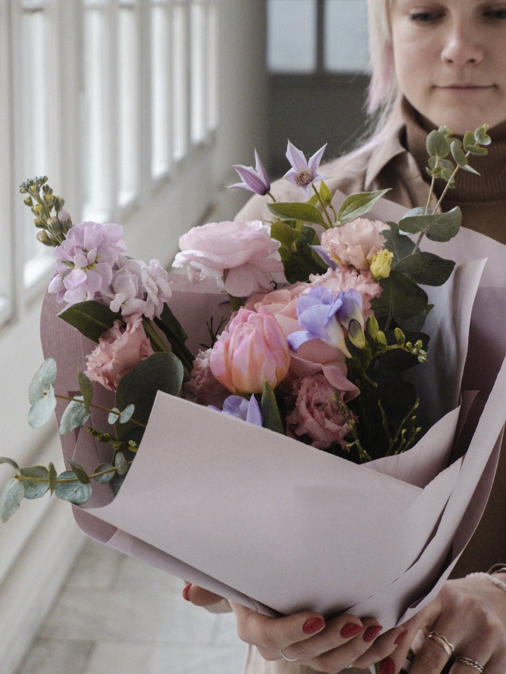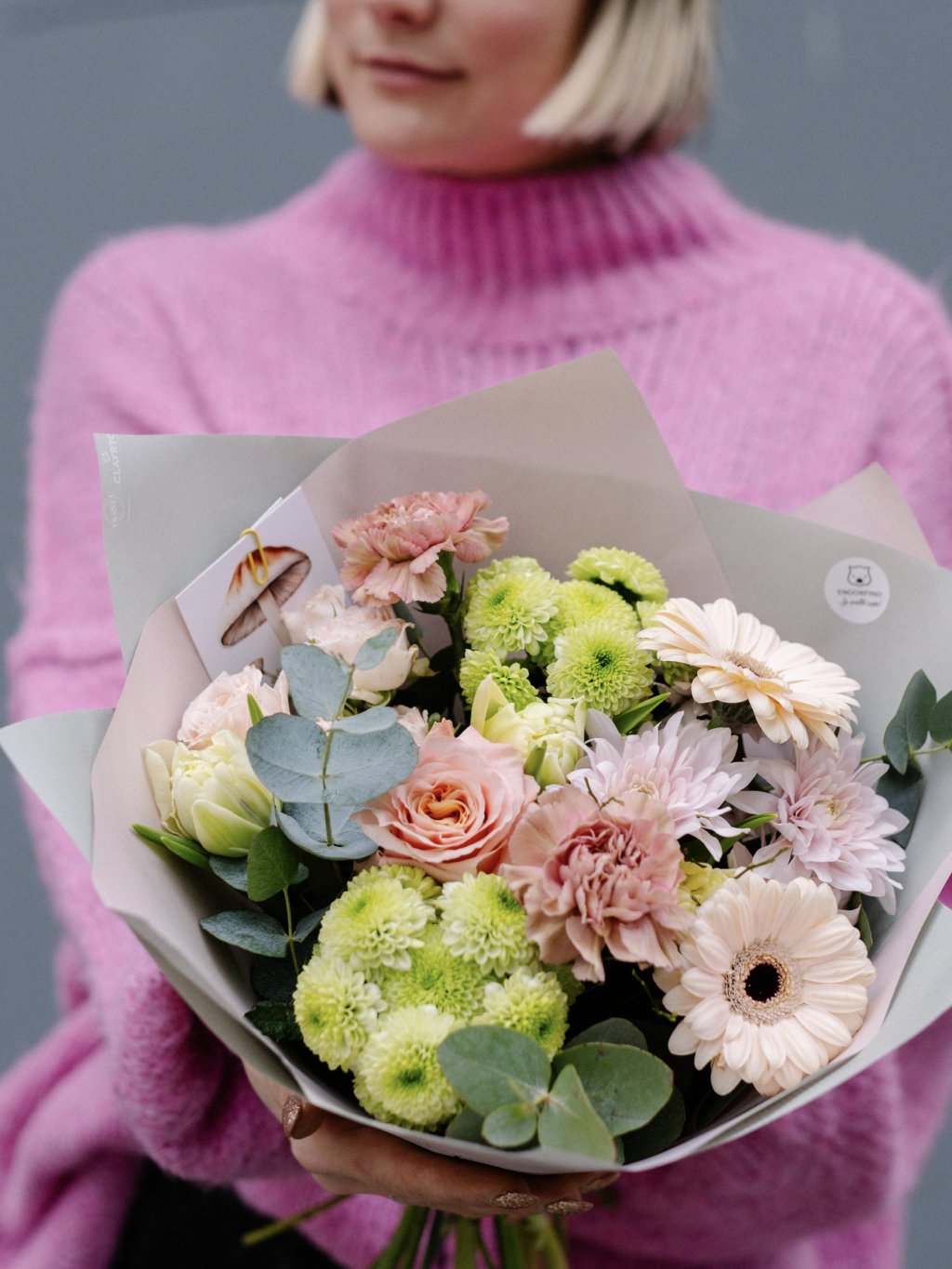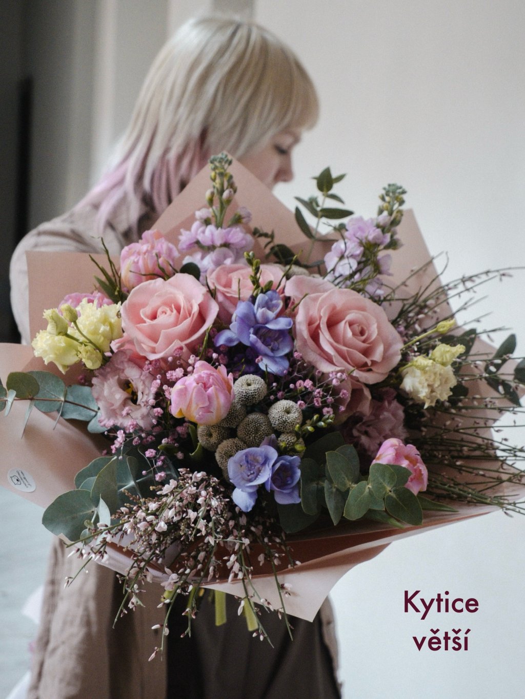 Kytice jemná jako něžné objetí. Kompozice převážně v růžových odstínech, decentně doplněná o světlé tóny je jako milostný dopis psaný květinami – plný krásných slov, která není třeba vyslovit.